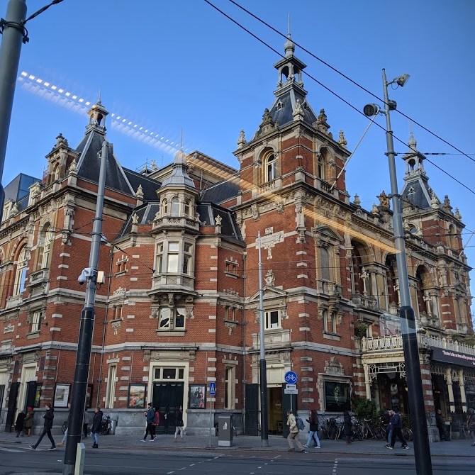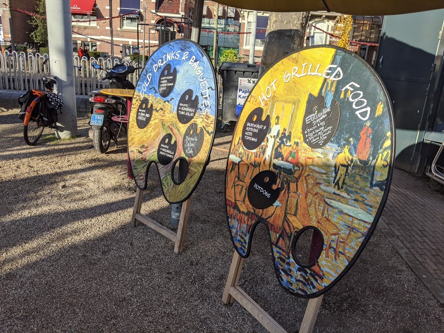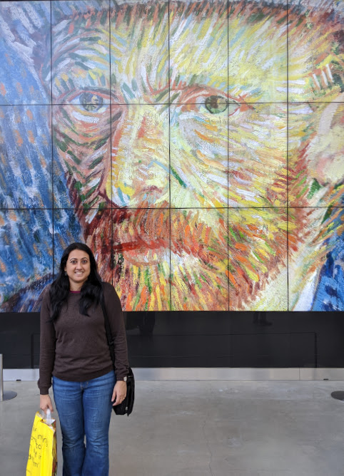 The prettiness overwhelmed us as we strolled lazily around the bicycle-city. Flocks of people rode up and down the narrow winding lanes around the canal in colourful bikes, aimless walkers (like us) often stopped at various corners to marvel at street-side art, curio shops, modern art and sculpture galleries, or the neat and beautiful cityscape along the canals. The cheerful sounds of the city reverberated everywhere. We eventually found our way to the Museum Square through the domed gothic architectural pathway of the Rijksmuseum, where musicians were performing with guitar, harp, and violin for the passers by. The green field in front of the Rijksmuseum (which included an ice skating rink) was so green and the afternoon sky was so blue that it seemed they were freshly painted. The Van Gogh Museum, holding the largest collection of the Master in the world, stood right across. People were on the grass lazing, chatting, and beaming in the festive sun! The cafes around had palette shaped menu boards offering hotdogs and wine. I do not recollect experiencing this kind of freshness in the air and the mood in a very long time!