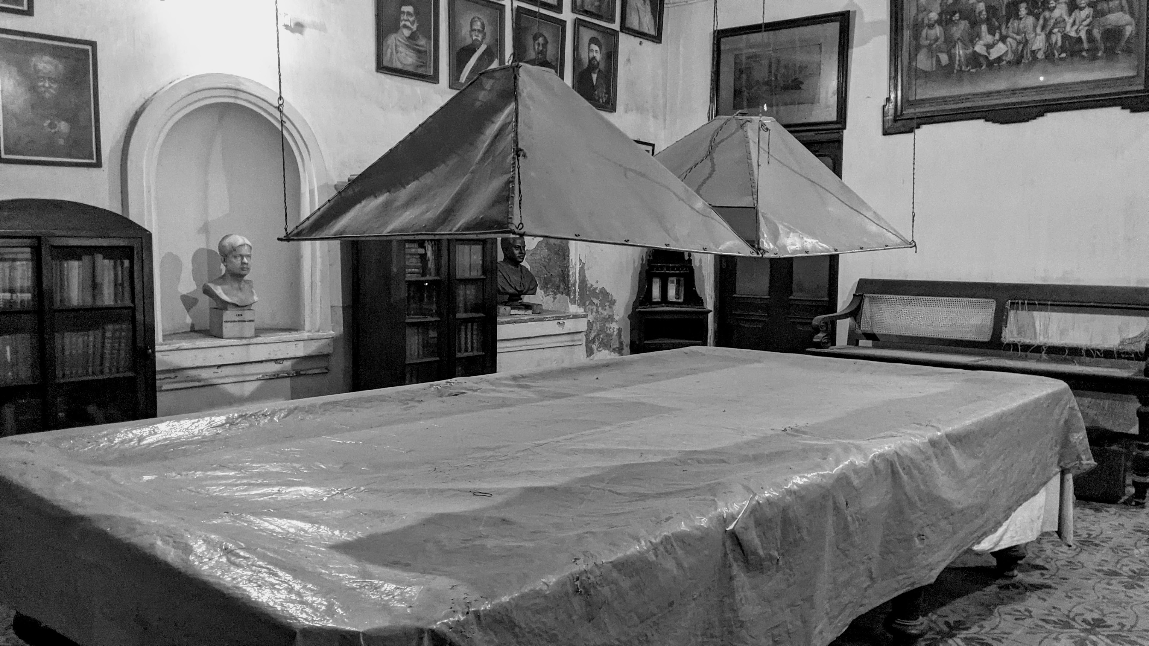 The billiard room had a huge billiard board, a billiard score keeping stand, high chairs on either side (presumably for the audience), antique lights, and photographs and paintings. The long windows of this room opened to the ‘thakur dalan‘ and gave the sense of a different era.