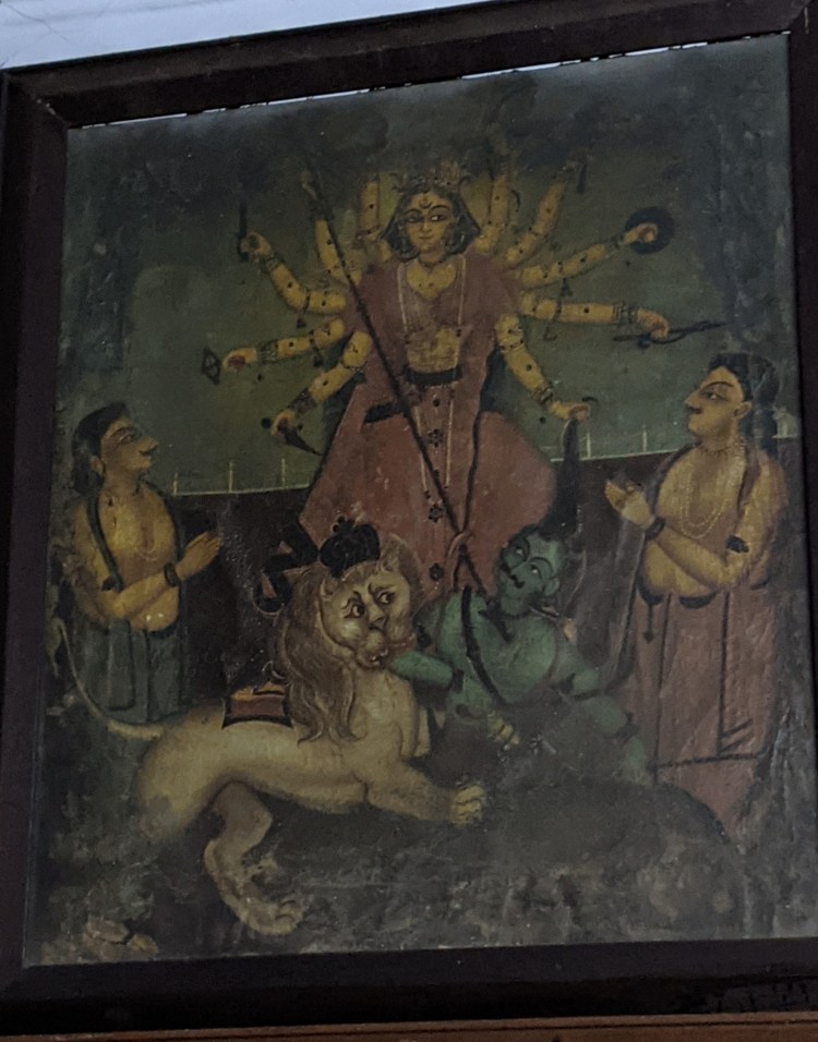 The terrace overlooking the thakur dalan was huge, and led to another portion of the house with cozy habitable rooms. Stunning paintings hung from the walls, mostly of Durga and her different manifestations, leaving me spellbound! The paintings were weathered through time but their timelessness showed in their artistry and colours. Though the painters are unknown (at least to us), and their identities are probably lost to history, in my opinion, they can challenge any gallery collection of folk paintings.